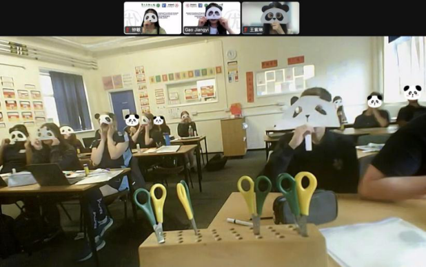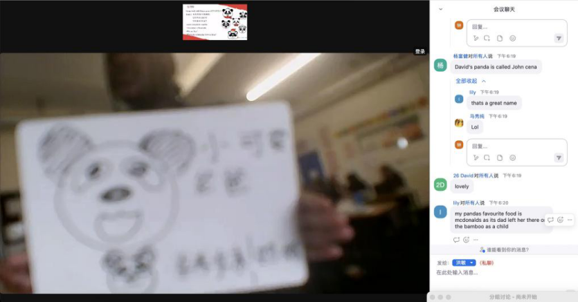 在教学中,营员们通过生动的主题视频和老师的精彩讲解学习了熊猫的生活日常。在和老师的互动中,同学们纷纷用所学的词语、句子分享自己的日常生活以及对熊猫的喜爱,还有学生表示有机会一定要来中国看看大熊猫。在语伴互动中,中英学生用中文交流了自己的感受,一起画出了自己的熊猫。通过共同合作,中英同学增添了默契,友谊也悄然而生。