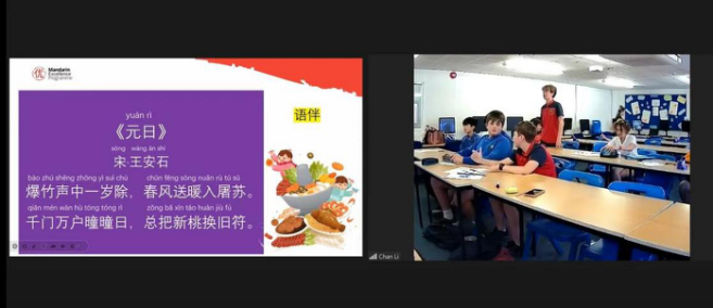 中国是诗的国度,古典诗词更是中国文化百花园中的一块靓丽瑰宝,是中华传统文化的重要组成部分。老师们用一首《元日》带同学们领略中国诗歌之美,同学们也积极和语伴交流,想了解更多关于中国的诗歌文化。