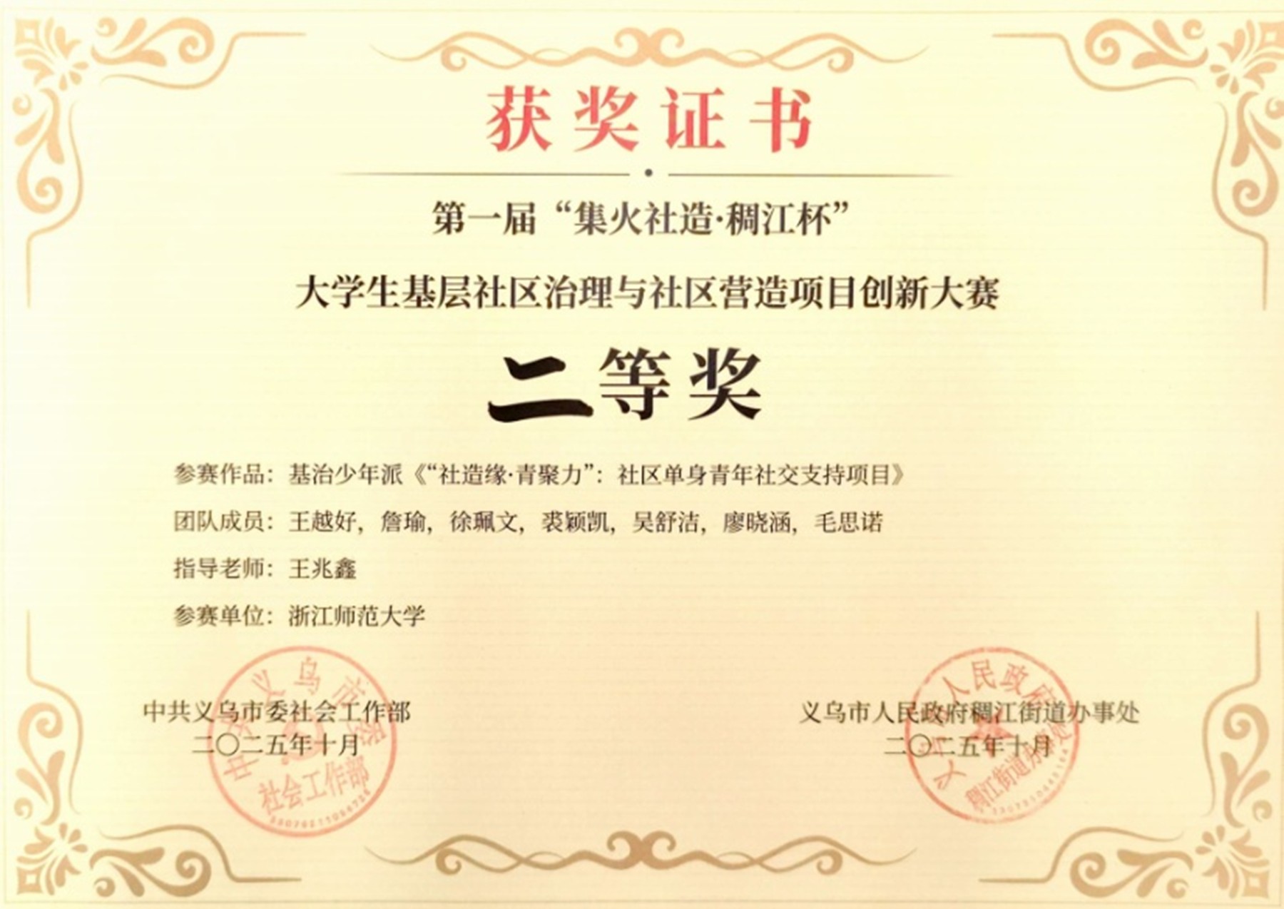近日,集火社造・第一届“稠江杯”大学生基层社区治理与社区营造项目创新大赛在义乌市稠江街道圆满落幕。我院“基治少年派”团队依托社会工作专业的理论支撑与实践方法,凭借《“社造缘・青聚力”:社区单身青年社交支持项目》的精准需求回应、创新服务设计与扎实落地成效,从全省12所高校多支参赛队伍中脱颖而出,斩获大赛二等奖,指导教师王兆鑫获评优秀指导老师。此次获奖不仅是团队实力的彰显,更充分体现了我院社会工作专业“以实践破题、以专业赋能”的育人特色,为专业建设与基层治理服务融合写下生动注脚。